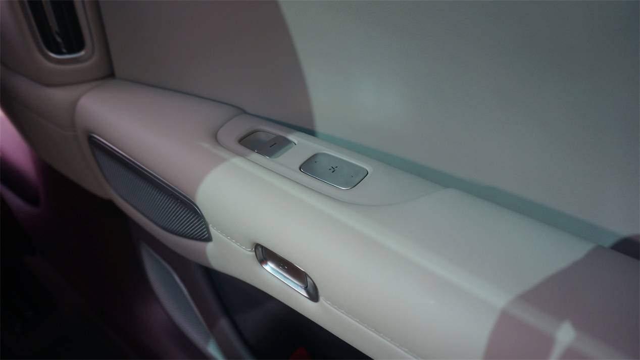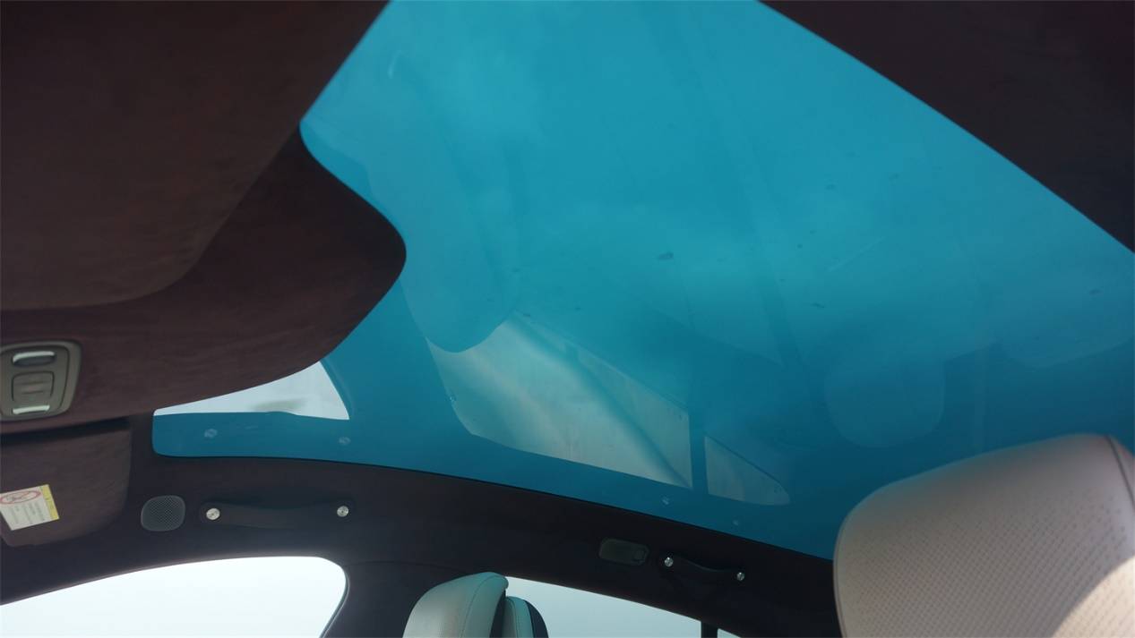 沒有遮陽簾的YU7,在頂配上增加了可變色的全景天幕。然而和極氪001一樣,透光狀態下天幕看起來泛著偏綠的藍色,觀感稍顯一般。遮光效果下的灰黑色效果會更好一些。從透明狀態到遮光狀態大約需要幾分鐘的時間,變色的過程如同水墨畫染色一般,看起來感覺有點奇怪。