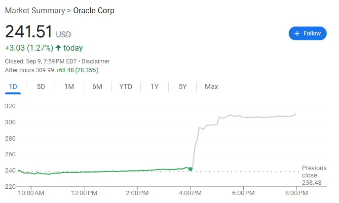 隔夜,甲骨文公司(Oracle)股價(jià)在盤后一度飆升超27%,創(chuàng)下互聯(lián)網(wǎng)泡沫以來(lái)的最佳單日表現(xiàn)。盡管季度營(yíng)收不及預(yù)期,但一份來(lái)自O(shè)penAI的巨額云基礎(chǔ)設(shè)施合同,讓其“剩余履約義務(wù)”(RPO)猛增至4550億美元,徹底點(diǎn)燃了市場(chǎng)對(duì)AI驅(qū)動(dòng)增長(zhǎng)的狂熱預(yù)期。