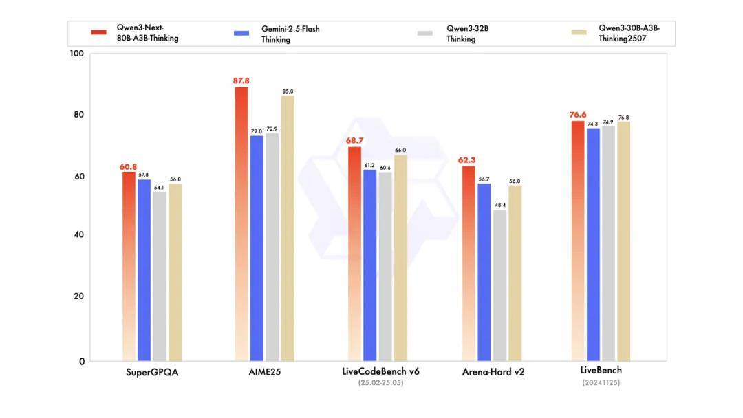 在編程(LiveCodeBench v6)、人類偏好對齊 (Arena-Hard v2) 以及綜合性能力 (LiveBench) 評測中,Qwen3-Next-Instruct 表現甚至超過了千問的開源旗艦模型,并在包含通用知識(SuperGPQA)、數學推理(AIME25)等核心測評中全面超越了 SOTA 密集模型 Qwen3-32B;Qwen3-Next-Thinking 則全面超越了 Gemini2.5-Flash-Thinking,在數學推理 AIME25 評測中獲得了 87.8 分。而達到如此高水平的模型性能,僅需激活 Qwen3-Next 總參數 80B 中的 3B。