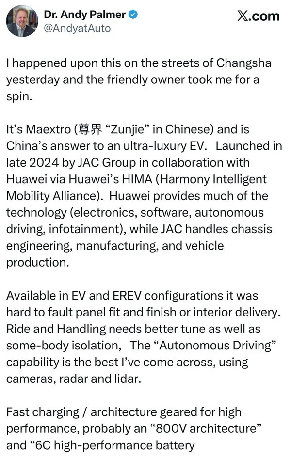 CNMO注意到,作為“汽車行業老炮”,Andy Palmer在社交平臺上對尊界S800給出了直接而具體的評價:
