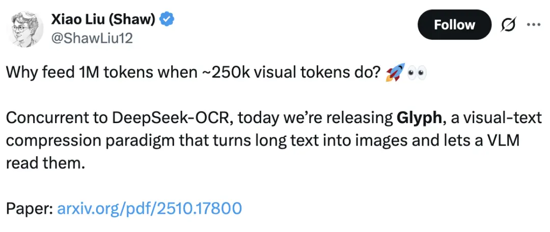 太卷了,DeepSeek-OCR剛發布不到一天,智譜就開源了自家的視覺Token方案——Glyph。