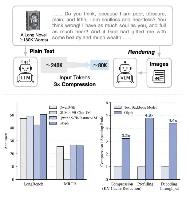 相比之下,Glyph不會逐字閱讀,而是先把整段文字排版成圖像式的視覺Token,再把這張「截圖」交給VLM去處理。