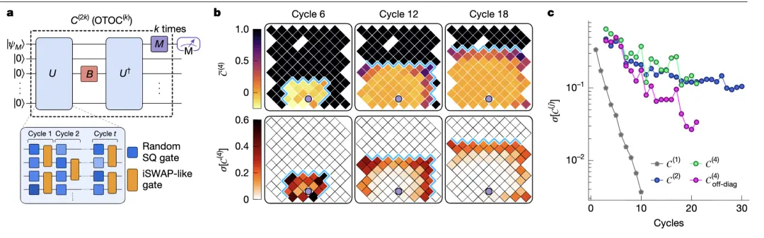 傳統(tǒng)的TOC信號(hào),演化9個(gè)周期后就弱到幾乎測(cè)不到(標(biāo)準(zhǔn)差<0.01);但測(cè)的OTOC(尤其是二階 OTOC,記為 OTOC?²?),就算演化20個(gè)周期,信號(hào)依然清晰(標(biāo)準(zhǔn)差>0.01)。