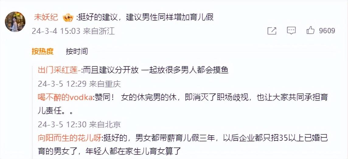 網友:拍腦門建議,看似女性福利,實則加強女性歧視,使企業更加不敢雇傭女性。真正好的建議:延長男性帶薪育兒假,做到跟女性一樣的條件。鼓勵男性多參與育兒,女性才可能更有意愿生育