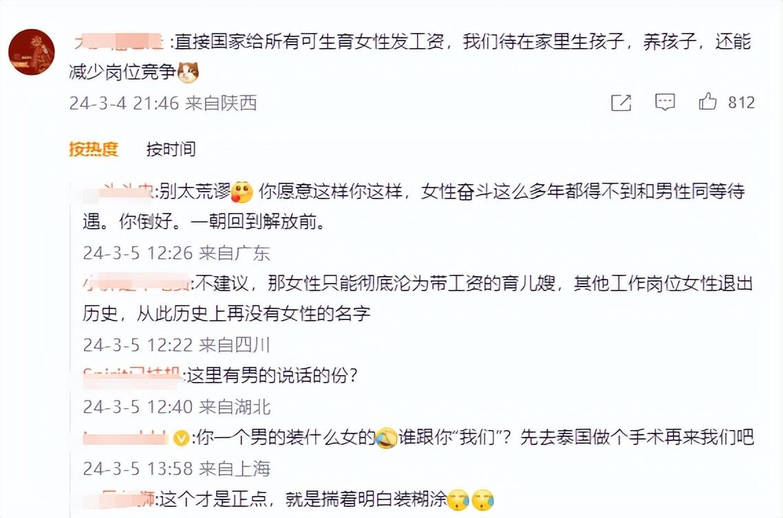 網友:直接國家給所有可生育女性發工資,我們待在家里生孩子,養孩子,還能減少崗位競爭