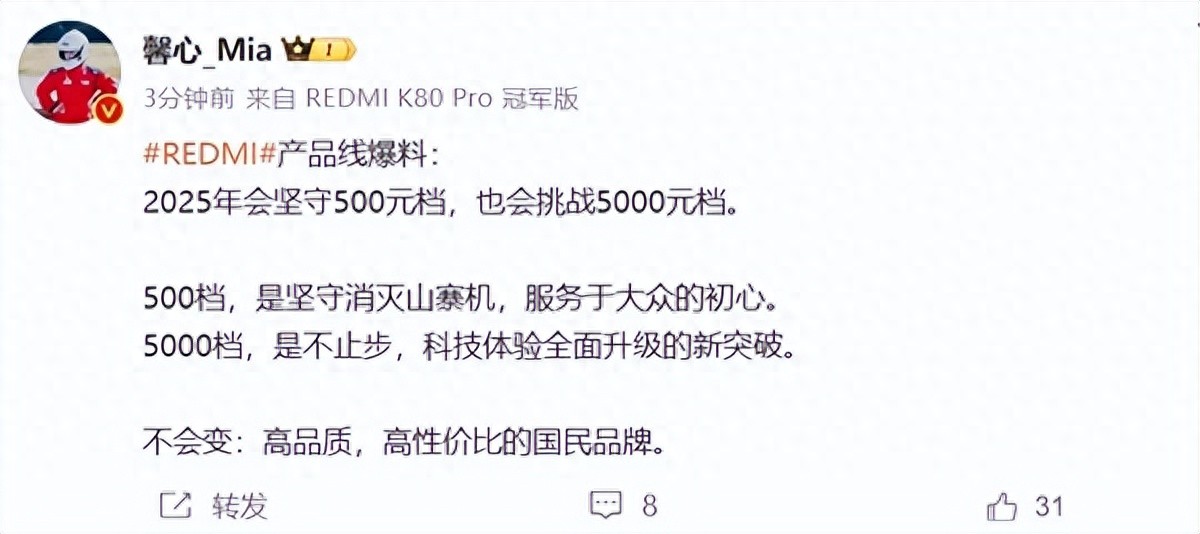產品經理@馨心_Mia 今日也透露了2025年REDMI的產品線規劃,她表示紅米今年會堅守500元檔,也會挑戰5000元檔!其中500元檔堅守是為了消滅山寨機,服務于大眾的初心。而5000元檔是為了全面升級突破
