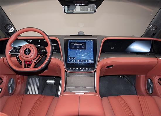 內飾方面,新車中控臺采用對稱式設計,大尺寸縱置中控屏配合兩側內嵌式液晶儀表+副駕娛樂屏,整體科技感直接拉滿。車內提供雙拼色的配色方案,并加入鍍鉻元素,帶來精致感的提升。后排配備獨立座椅,配備中央扶手娛樂控制屏、后排娛樂屏,可以為后排乘客提供更好的娛樂體驗。