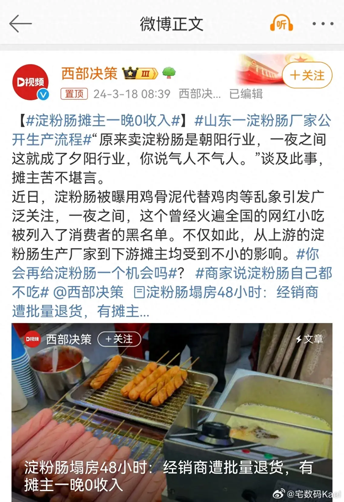 2024年3月15日,淀粉腸被曝存在用雞骨泥代替雞肉、以次充好、脂肪含量越來越高、無專門國標(biāo)的亂象。受此影響,一些淀粉腸攤主一晚0收入。