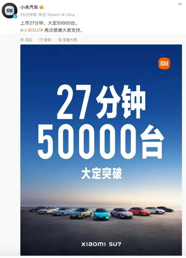 據小米汽車的官方微博消息,4分鐘大定破萬,7分鐘大定破2萬,27分鐘大定破5萬。