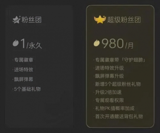 此外,此次更新也新增了直播超級粉絲團玩法。除了常見的粉絲團玩法,此次新版本中微信又將粉絲團進階,增加了一個超級粉絲團。據了解,超級粉絲團擁有專屬徽章“守護翅膀”,還有進場特效、飄屏彈幕升級、專屬觀看權限、禮物PK值概率加成等諸多特權,專為主播的狂熱粉打造,價格也達到了980微信豆/月。