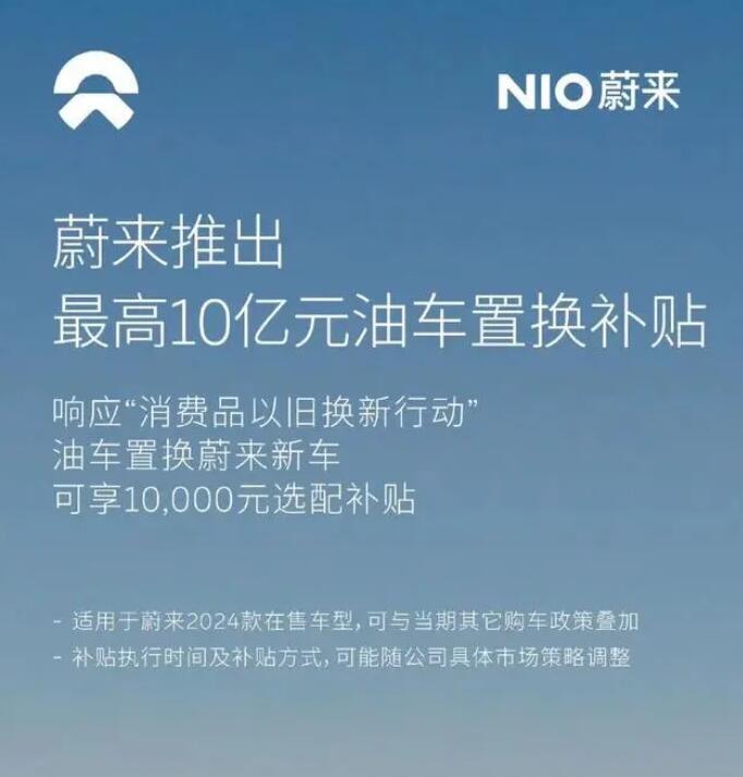 蔚來汽車推出最新促銷優惠,4月份,該品牌主打“以舊換新”,油車置換蔚來新車,可享受10000元選配補貼。官方海報上表示,福利可以疊加,最高可達3萬元。