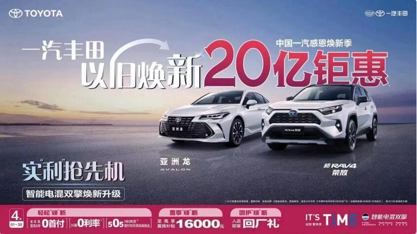 另外,還有一汽豐田,在4月份推出“以舊換新”活動,從官方海報看,消費者至高能享受1.6萬元的置換補貼。 并沒有太多降價和優惠,力度也不是很誘人。