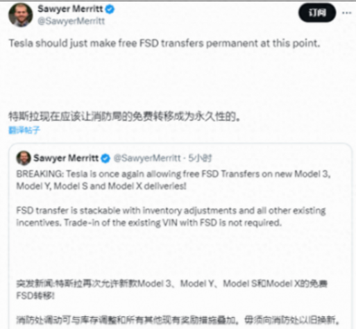 首頁(yè) > 智駕游記 > 特斯拉再次開(kāi)放FSD免費(fèi)轉(zhuǎn)移功能,并可能提供永久服務(wù)