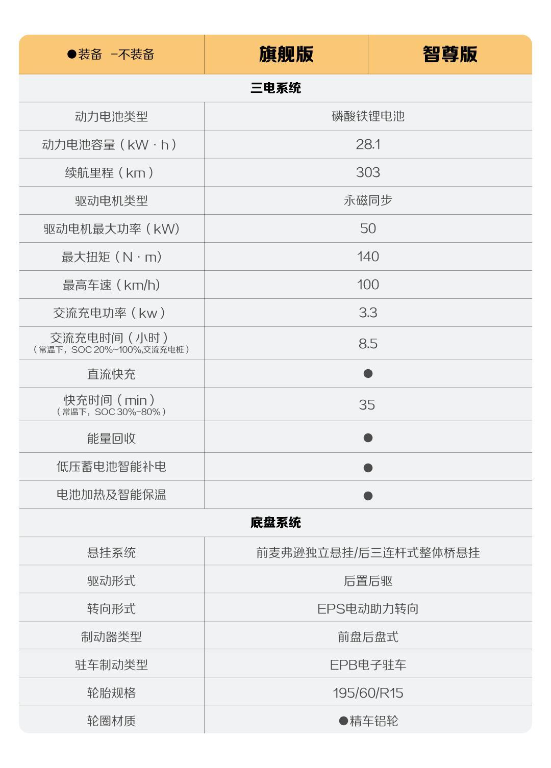 動力方面,新車搭載最大功率50kW、最大扭矩140N•m的永磁同步電機,并匹配28.1kWh的磷酸鐵鋰電池,續航里程達303km。