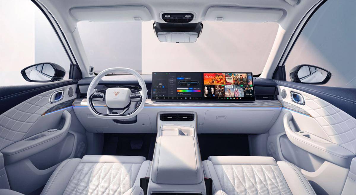 內飾采用了環抱式布局,門板及座椅采用了菱形格紋軟質材料包覆,營造出不錯的內飾高級感。中控臺配備了小尺寸液晶儀表,以及由中控屏與副駕屏組成的雙15.6英寸連屏,為用戶帶來沉浸式的影音娛樂體驗。