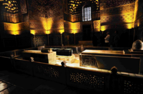 橫在地上的石塊是墓碑,棺槨深埋在地下。帖木爾墓碑周圍是子孫的墓碑,而頭頂的是他的老師。放在頭頂的位置是為了表示尊敬。
