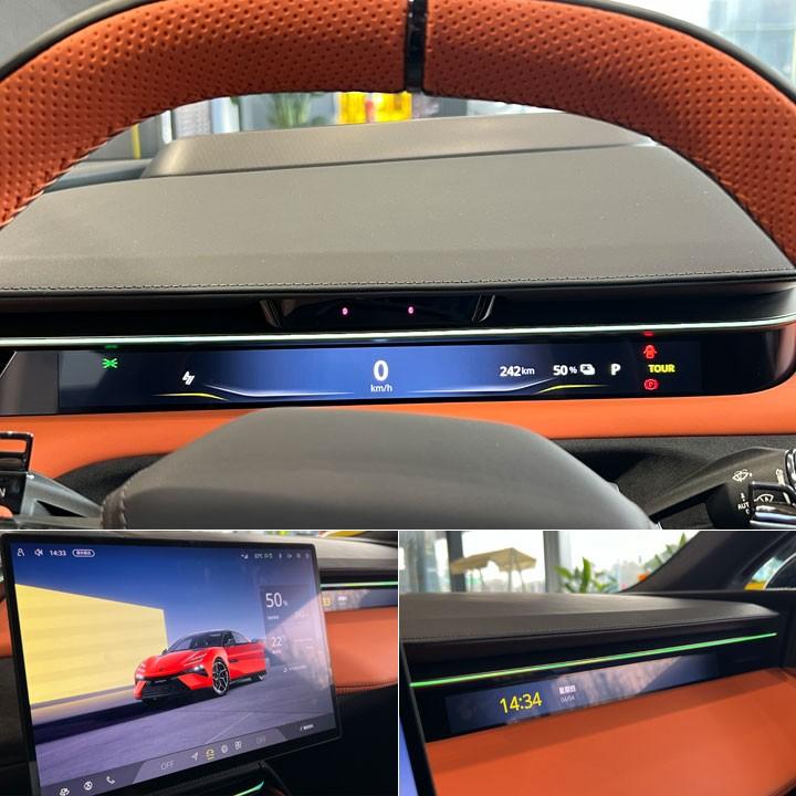 不過中控臺的設(shè)計就沒那么「超跑」了,左右各有兩塊 12.6 英吋的細(xì)長液晶熒幕,中間是 15.1 英寸的 OLED 全彩熒幕,搭載了路特斯Hyper OS 座艙系統(tǒng),并內(nèi)置了兩塊高通的 8155 芯片。此外,Emeya 還搭載了 55 英吋的 AR-HUD 抬頭顯示器、串流媒體后視鏡以及 ERMD 串流媒體外后視鏡。