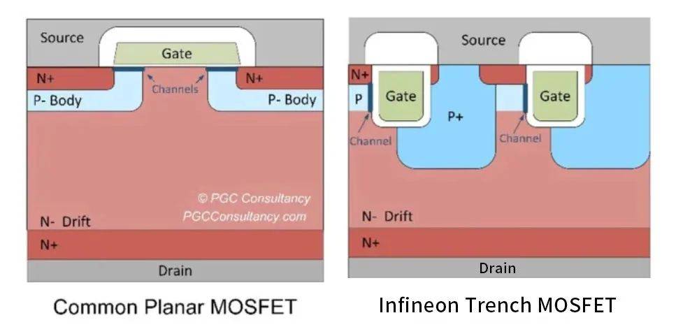 (圖左為平面工藝,圖右為英飛凌的溝槽工藝)
