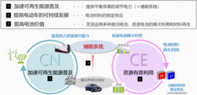 豐田自1997年推出世界首款混合動力車型普銳斯PRIUS開始,便在節能環保和資源利用方面不斷做出努力。作為主流車企,豐田以實現汽車產品全生命周期的節能環保為目標,不僅要打造出用戶體驗至上的電動化車型,還要完善動力電池的后處理產業鏈,最大限度地有效利用資源,促進產業可持續發展。為此,豐田從CN(Carbon Neutral碳中和)和CE(Circular Economy循環經濟)兩個方面推廣新型循環儲能系統*1,擴大豐田在能源綜合利用領域的事業。