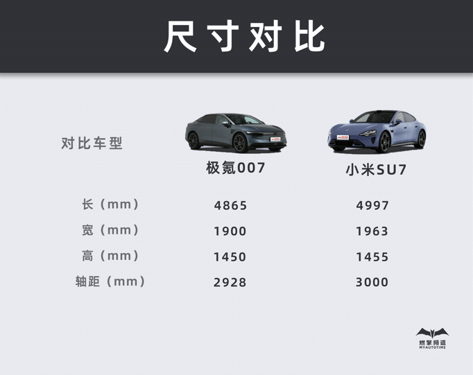 極氪007和小米SU7的定位分別為中型車和中大型車,所以二者的尺寸還是有一定差距的。前者的長寬高分別為4865mm、1900m和1450mm,軸距為2928mm,后者的長寬高分別為4997mm、1963mm和1455mm,軸距為3000mm。